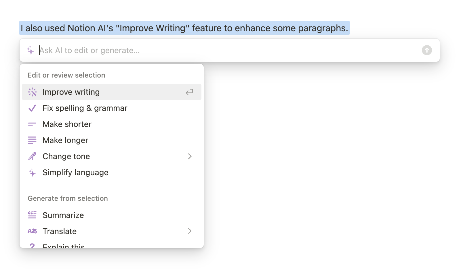 So, I decided to expand on the ideas myself, section by section, using ChatGPT to write every part instead of asking it to write the whole blog post. Additionally, I used Notion AI's "Improve Writing" feature to enhance some paragraphs.